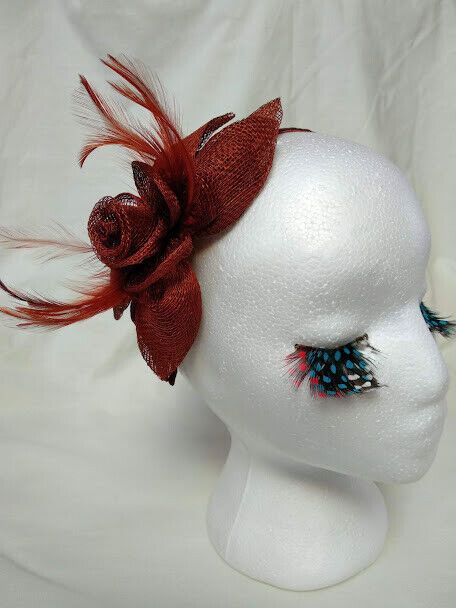Bonito tocado para ceremonia color marrón teja con forma flor confeccionado con rafia y plumas.