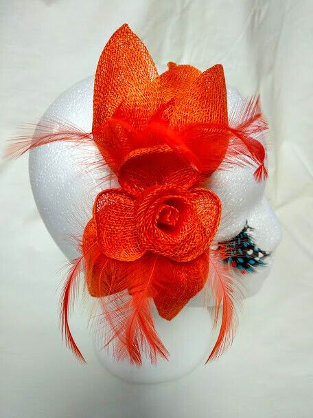 Bonito tocado para ceremonia color naranja con forma de pequeño casquete vertical con flor confeccionado con rafia y plumas.